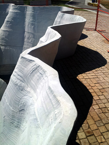 BT: That was the hardest thing, frankly. Here’s we were working with this concrete that is used to make overpasses, and train stations, and this is the first time it’s ever been used for a sculptural project of this scale. It behaves very differently from other concretes: when it’s first mixed it has the consistency of whipped cream. How to make the mold was a big issue. What we ended up doing was getting these enormous blocks of foam, 8 foot by 4 foot by 4 foot. What the fabricator did was to draw the plan of the top of the panel, and the plan of the bottom of the panel on either side of this gigantic block. And then I made a hot wire, and made all kinds of bents in this piece of wire, and then two people pulled this wire through the giant block of foam directed by a third person who would call a number, and they created this texture. The beauty of the texture is the fact that it’s an actual record of the physical effort that went into producing the molds themselves. If it is to describe its color, I’d say it looks like unglazed porcelain.